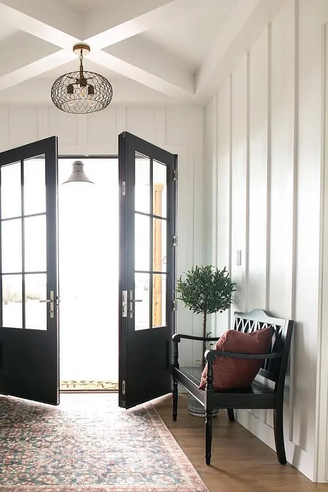 For those who want sharper contrast, Extra White on the trim against Chantilly Lace walls creates a more defined, graphic look. It is a cooler, brighter white that makes moldings and window frames pop without feeling aggressive. Works really well in spaces with a lot of trim detail.