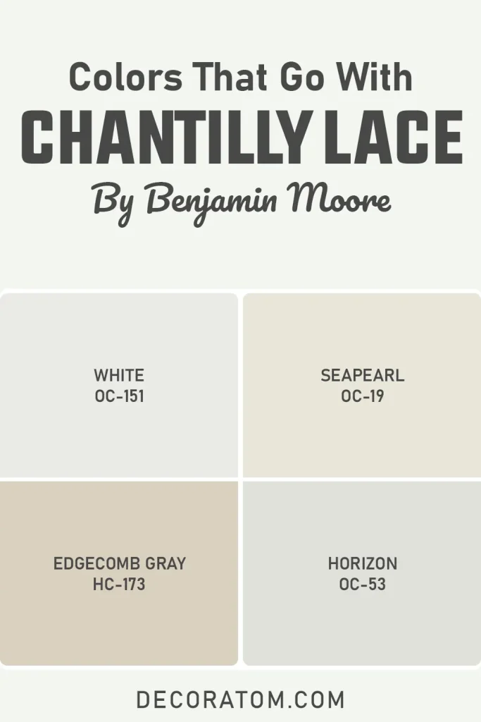 When I think about coordinating colors for Chantilly Lace, I gravitate toward tones that have the same kind of quiet, composed energy. Nothing too loud, nothing too muddy. The colors that work best alongside it tend to be soft grays, warm greiges, and gentle off-whites — shades that feel collected and calm rather than stark or busy.
