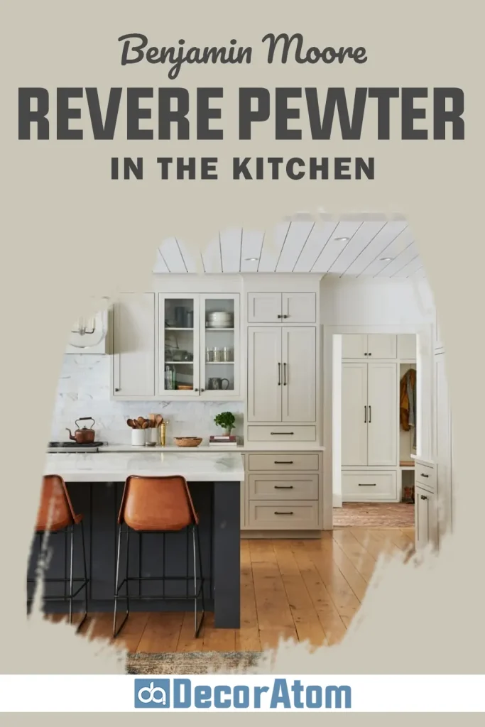 Another approach is using Revere Pewter on cabinets themselves. When paired with light countertops and backsplash tiles, the result can feel very sophisticated.