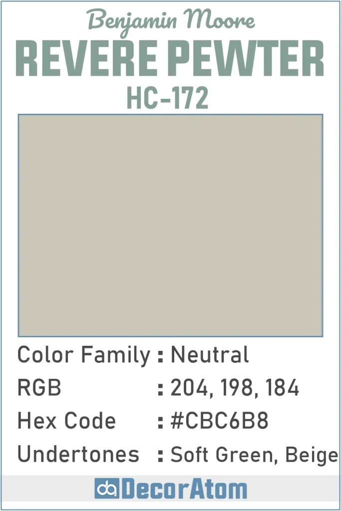 The Hex value of Revere Pewter is #CBC6B8.