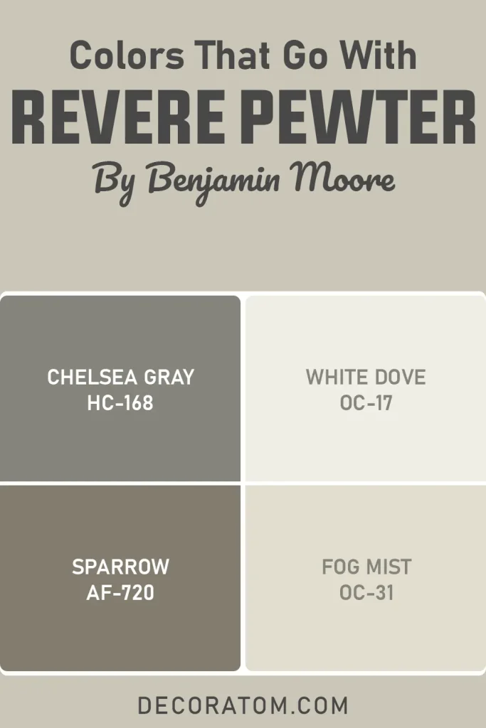 If you enjoy decorating with blues, soft greens, or even charcoal tones, Revere Pewter can easily support those colors without clashing. It acts like a calm background that allows other shades to stand out while still keeping the overall room cohesive.