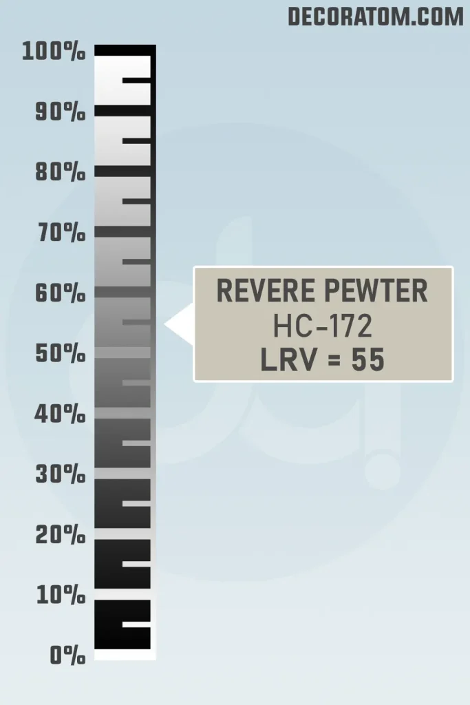 This puts it right in the middle of the scale. It is not too dark and not too light. Because of this balanced LRV, Revere Pewter works well in many different rooms. It reflects enough light to keep spaces feeling open, but it still has enough depth to give the walls some character.