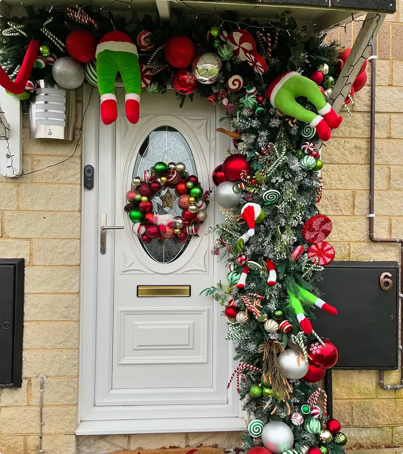 The little bits of Grinch popping up everywhere: legs dangling from the top, an arm holding a branch on the side, and then the mini-wreath with the red and green bulbs hanging in the glass panel. It’s like the Grinch tried to steal all the decor but accidentally got caught up in the process, making it a super dynamic and playful welcome!
