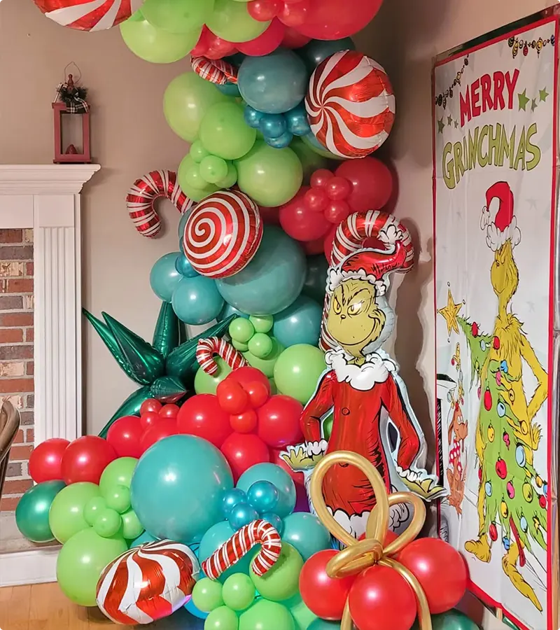 This balloon display is the definition of fun chaos! This design is brilliant because it really leans into the whimsical, swirly look of Whoville using giant Mylar candy cane and swirl balloons mixed right in with the traditional latex ones.