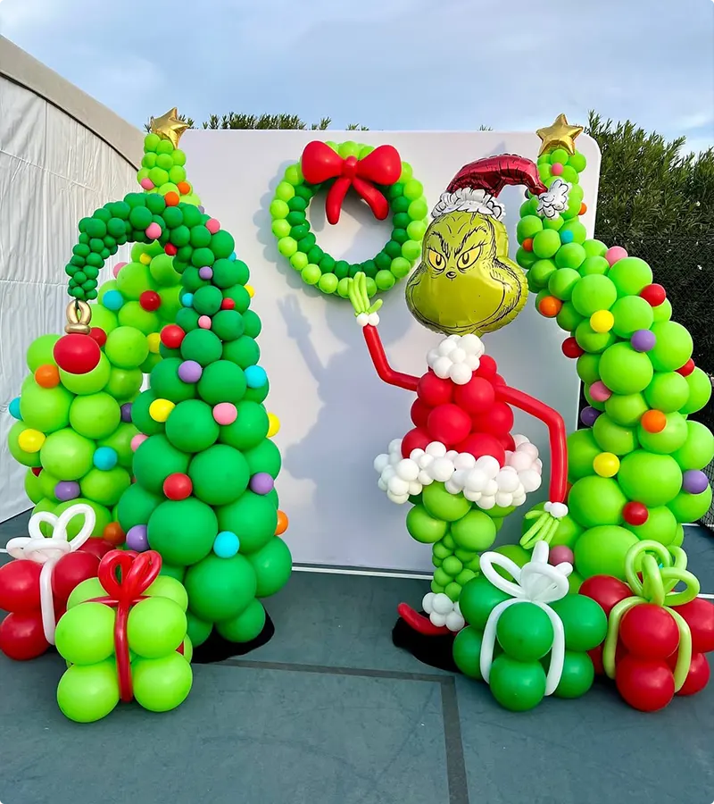 This is seriously advanced balloon art, and I am obsessed. The way they’ve sculpted the Grinch’s entire body using different sized green and red balloons is just fantastic, right down to the white trim on his Santa suit!