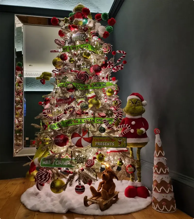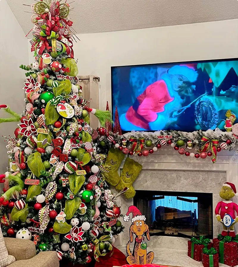 This is totally my speed when I don’t want to get glitter on everything. The genius here is the Grinch face tree skirt, it’s the perfect way to anchor the whole theme without having to go wild with 1,000 ornaments; I mean, you look at that smirk, and you know exactly what you’re celebrating!