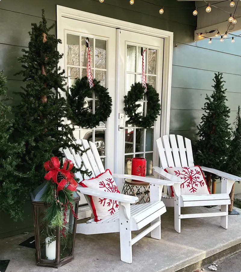 The design works because they used just a few key elements: a couple of simple green wreaths on the door, two skinny evergreen trees flanking the entry, and then those gorgeous, crisp white Adirondack chairs with the fun snowflake pillows.