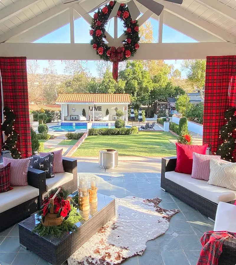 Oh my gosh, this is proving you can bring Christmas cheer literally anywhere, even to the patio by the pool! The design idea here is pulling warm, cozy cabin vibes outdoors using just a few high-impact textiles. See those bold red plaid curtains?