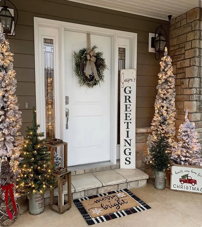 What makes this design work so well is the contrast between the clean, simple white door and the soft, glowing flocked pencil trees on either side, it’s super symmetrical and inviting.
