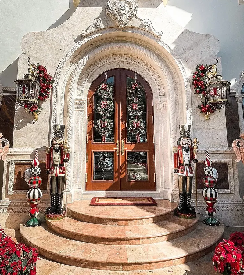 Wow, look at this entrance, it is just dripping with elegant, dramatic flair, which is perfect if you have an ornate house like this! The design secret here is that it leans heavily into a strong, formal theme using matching, oversized Nutcrackers as sentinels on either side of the door.