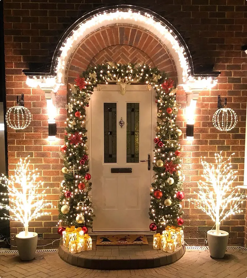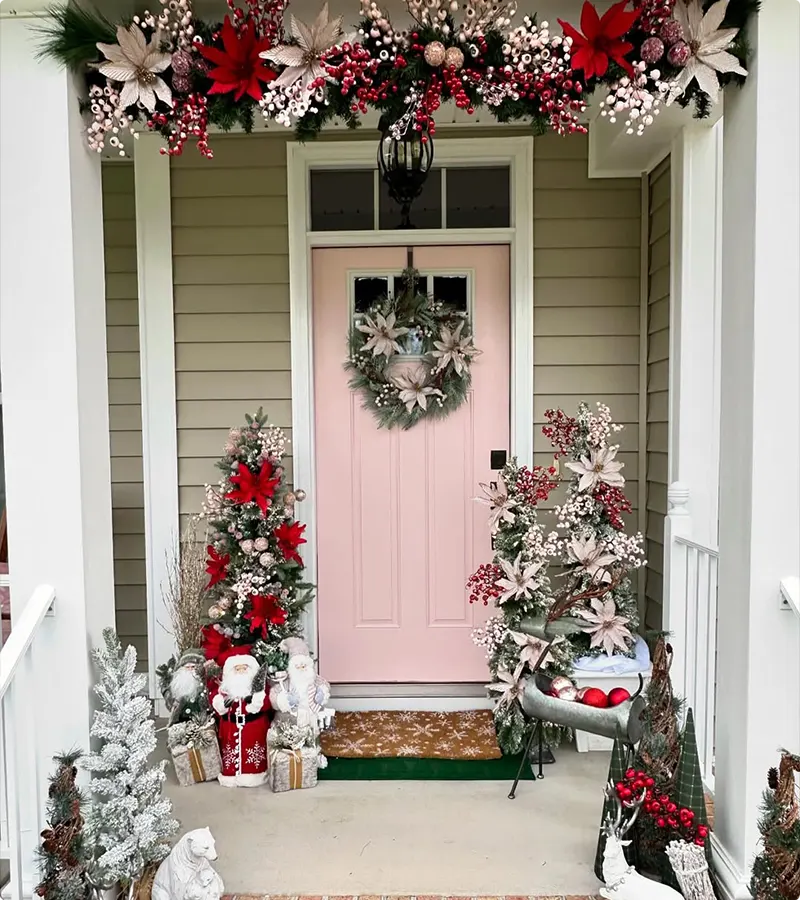Honestly, it just shows that you don’t have to stick to just red and green; throwing in a softer color like that pale pink really creates a unique and welcoming Outdoor Christmas Decoration look.