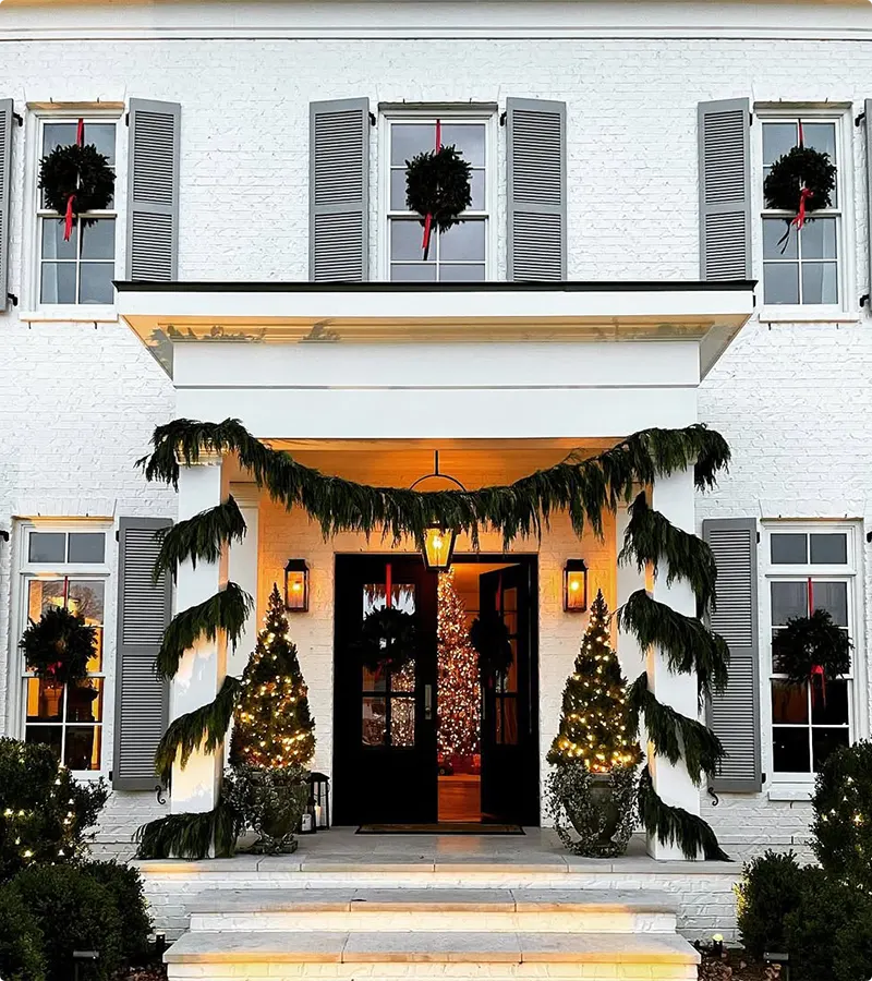 They smartly used those slim, twinkling potted Christmas trees to frame the door and then covered the porch in a gorgeous, thick, and very cozy-looking mixed garland.
