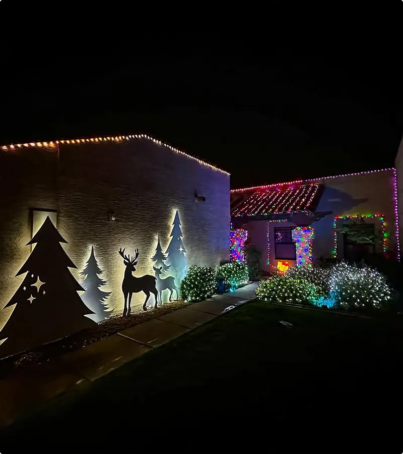 The key design idea here is using those enormous cut-out wooden or metal silhouettes of trees and deer, which are then backlit by bright, clean white light, creating this amazing, almost theatrical glow against the house.