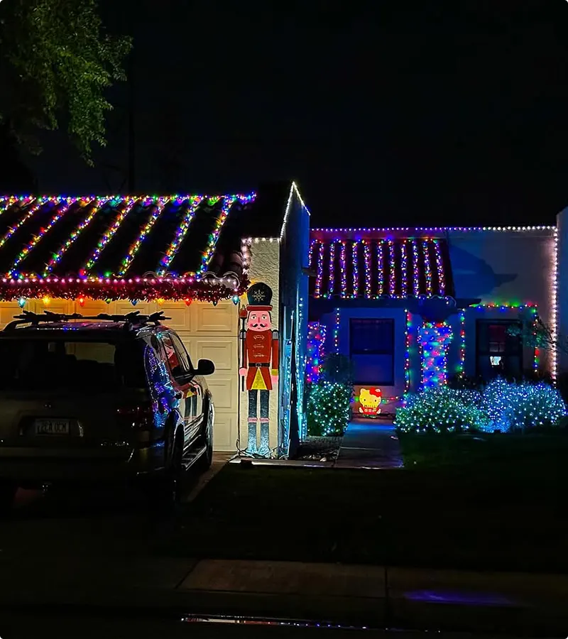 The best part, to me, is that giant, cheerful Nutcracker soldier standing guard right next to the garage door, it adds a fantastic focal point and some old-school character to all the modern lighting.