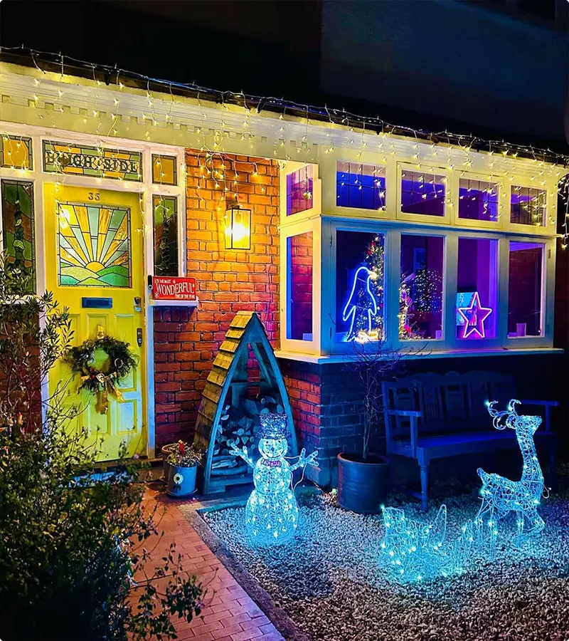 Those little additions, like the neon penguin and star in the window and that light-up, ice-blue reindeer and sleigh, give the whole front yard a playful, slightly retro feel that’s just super charming, you know?