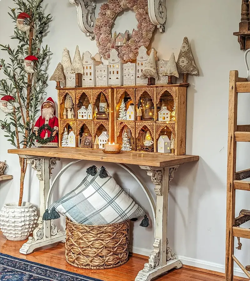 Isn’t this the dreamiest little village setup? We’re calling this the “Cloister Village” because of that amazing, arched wooden shelf that looks like an antique cathedral piece.