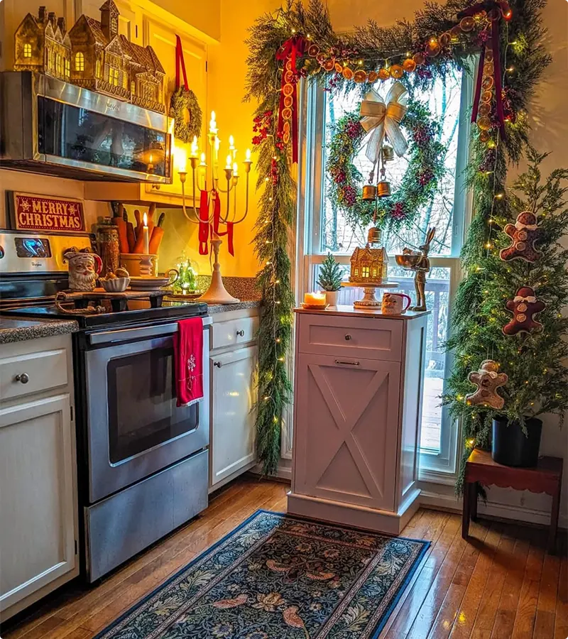The whole design works because the candle holders and the tiny light-up village houses on the microwave fill the room with that golden, romantic glow. It’s the perfect atmosphere for baking cookies, isn’t it?