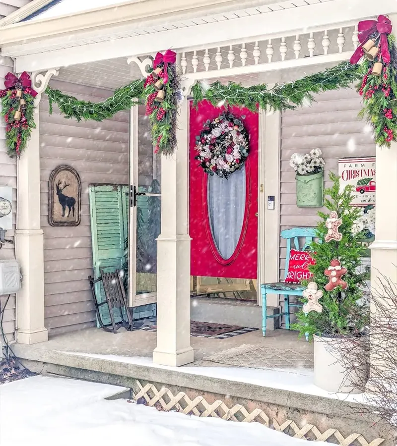 This porch is seriously welcoming and shows that curb appeal is everything, especially in the snow. They used a big red door as the backdrop for a huge wreath full of pink and white roses, which feels a little unconventional but totally charming.