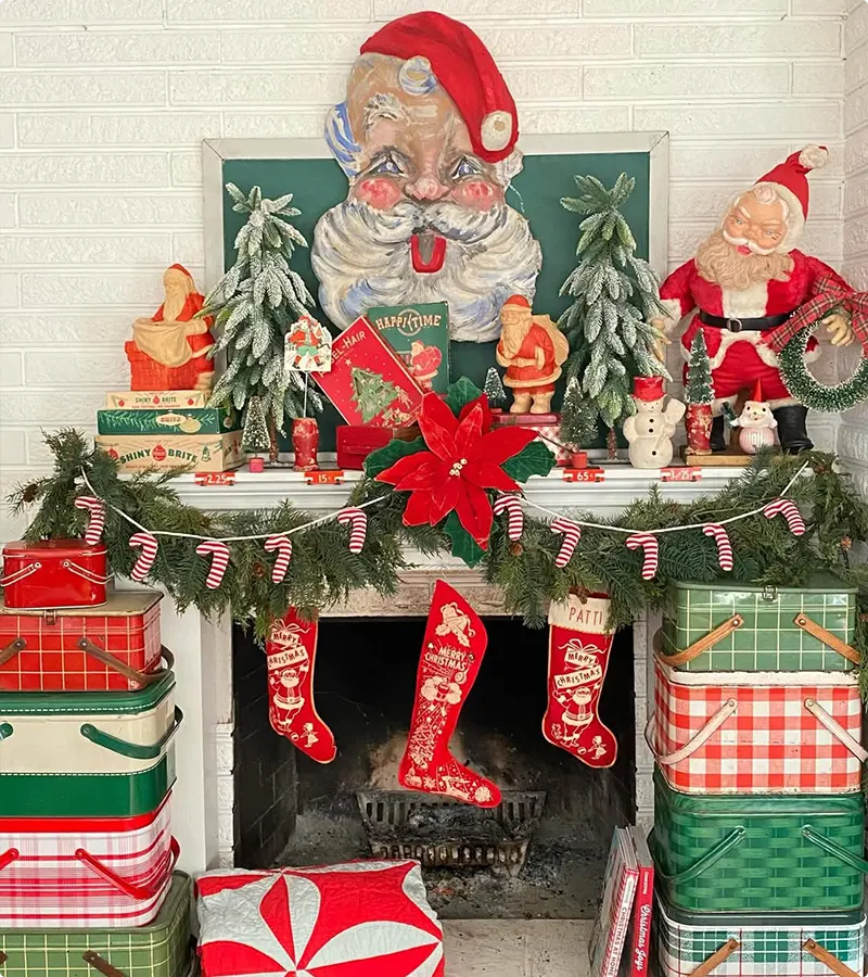 It feels wonderfully playful and slightly exaggerated, which is what vintage is all about. The key takeaway here is to stack up your presents and candy tins in front. This creates a charming, layered, and nostalgic scene.