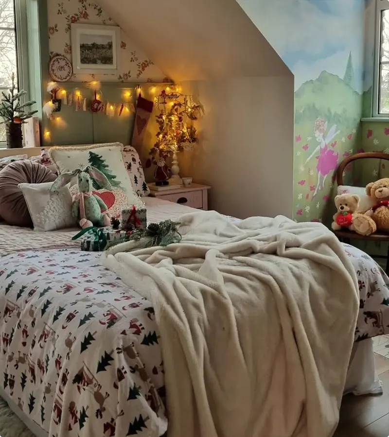 I love how they mixed in those charming, whimsical elements, like the plush rabbit toy and the soft pink bolster pillow. Stringing little fairy lights over the painted green wall creates this beautiful, twinkly glow that feels perfectly nostalgic and sweet for a winter’s night.