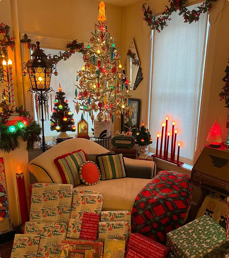It’s so bold. See those tall, thin electric candlestick lights next to the chaise? They add a dramatic, vintage holiday mood that’s both festive and cozy.