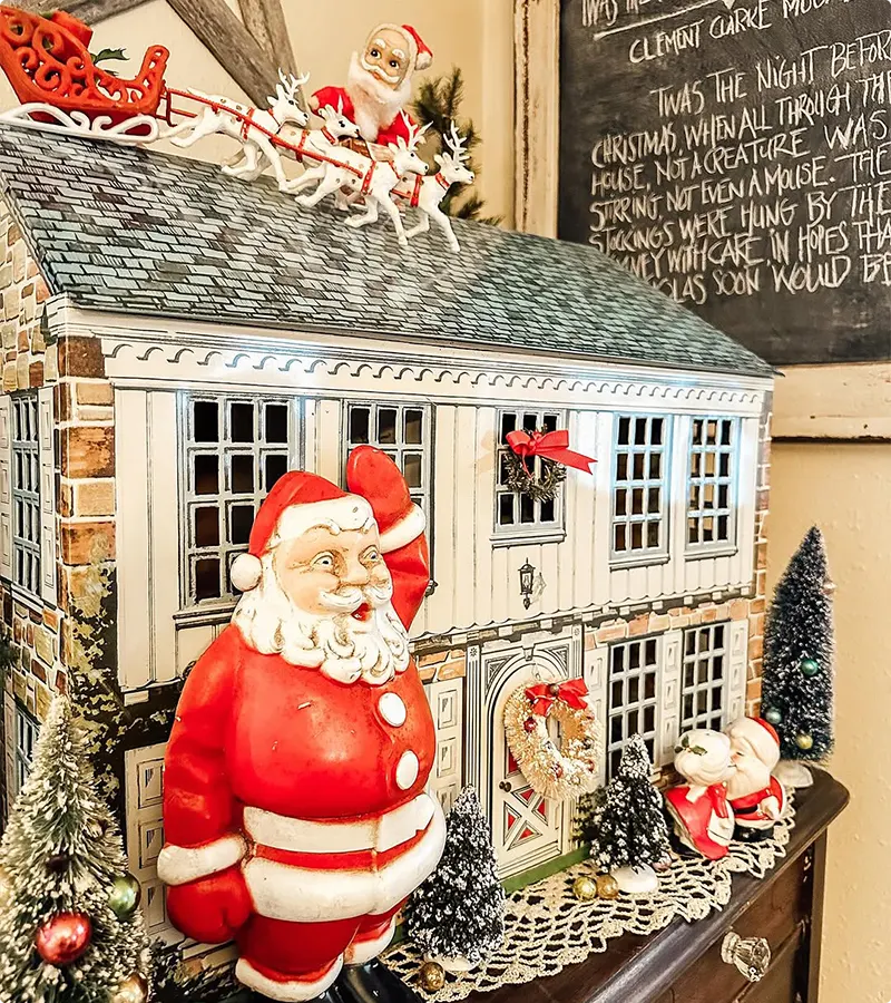 Placing a tiny Santa and his sleigh on the roof and adding those mini bottle brush trees makes the whole scene feel full of movement and life. It’s such an elegant take on a whimsical village display.