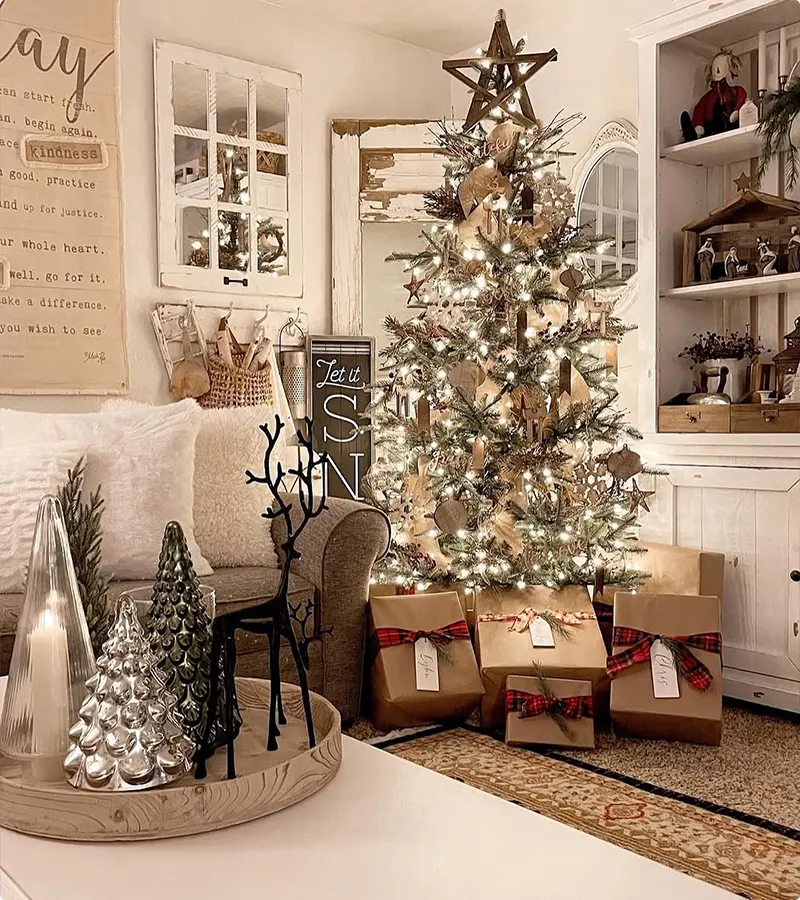 This feels like an elevated cabin vibe, perfect if you love neutral colors for the holidays! The key here is the beautiful layering of textures, you see those plush, fluffy white pillows next to the rustic reclaimed wood mirror and the tree.