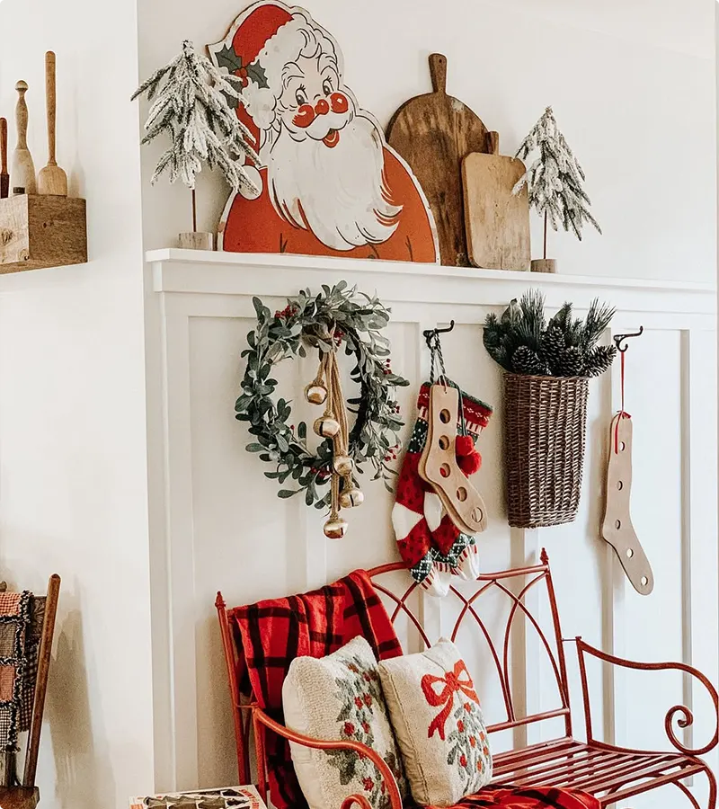 This sweet little entryway vignette is such a perfect example of blending farmhouse style with vintage Christmas touches. The oversized, classic wooden Santa cutout on the top shelf is the main event.