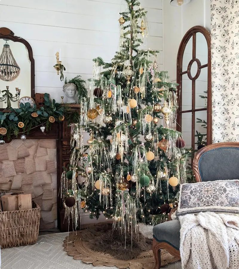 Look at that tall, kind of gangly Christmas tree. It’s not one of those perfectly manicured, symmetrical trees you see now, is it? This look totally works because it brings back the feeling of old-school Christmases when the tree was a little uneven, you know?