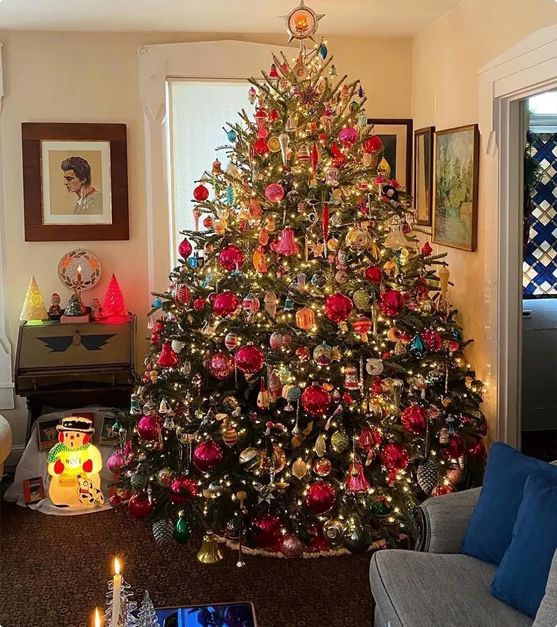 Now that is a classic Christmas tree! It’s so full and lush, and the use of deep jewel tones gives it such a luxurious vintage vibe. You can see they committed to a lot of rich red ball ornaments, mixing them with older, more unique pink and blue ornaments for depth.