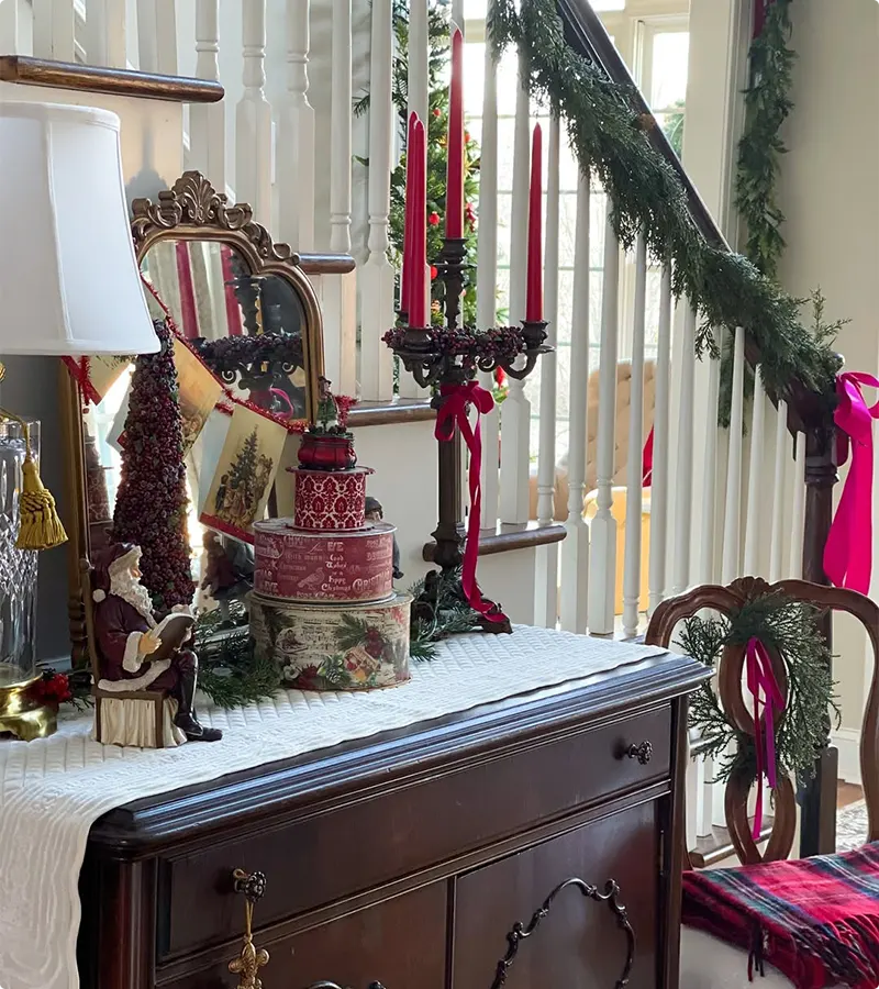 Adding a tall, white candelabra with cascading red ribbons and a lacy tree texture just makes it feel instantly luxurious but still cozy and vintage. I mean, who knew a brass bunny statue could look so festive?