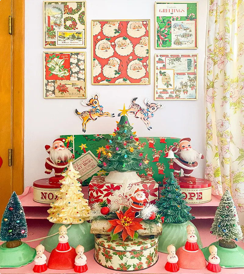 This is pure mid-century Christmas joy, don’t you think? It’s proof that a gallery wall and a tabletop display can totally live together! The main attraction here is that cluster of different-sized ceramic Christmas trees.