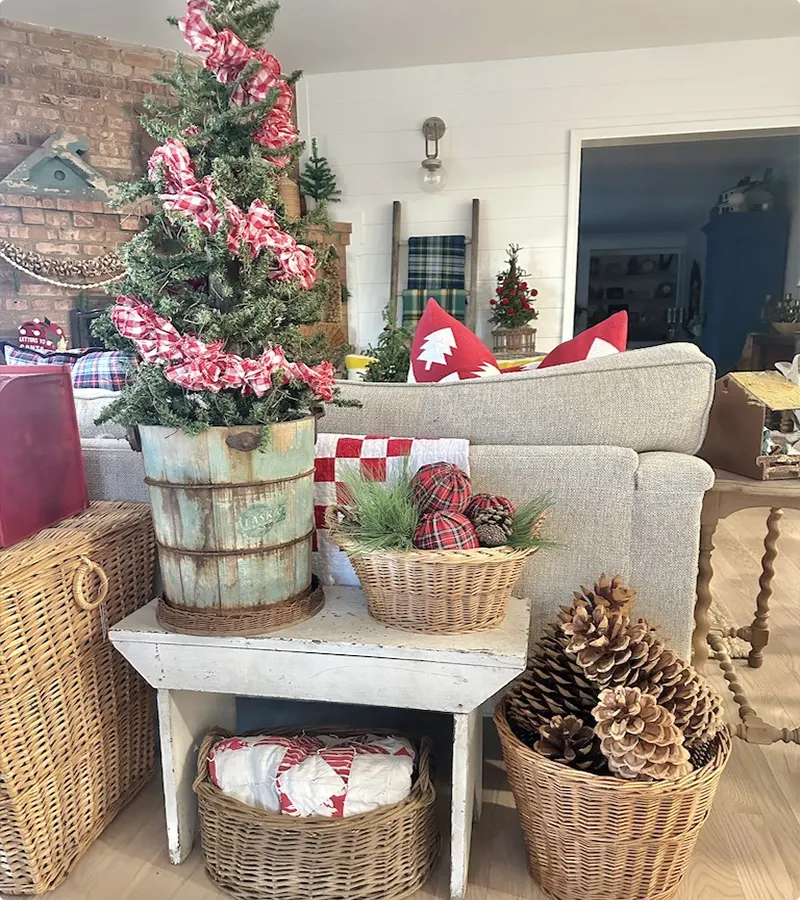 Look at all the texture! We see giant, natural pinecones spilling out of a basket, plus a few smaller baskets holding quilts and cute plaid ornaments.