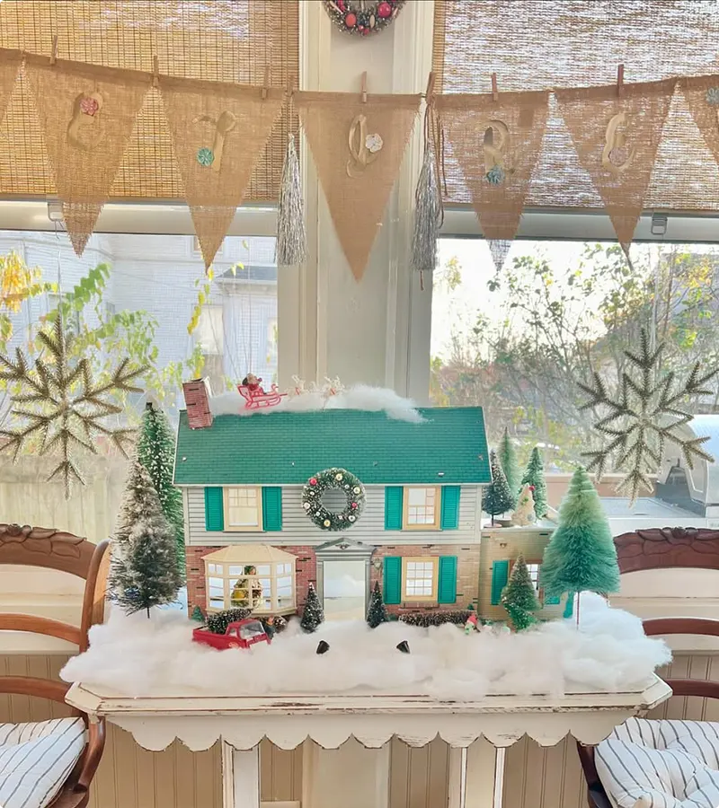 This picture is pure magic. It’s a whole little world set up on that console table. The star, obviously, is that beautiful vintage dollhouse decorated for the season.