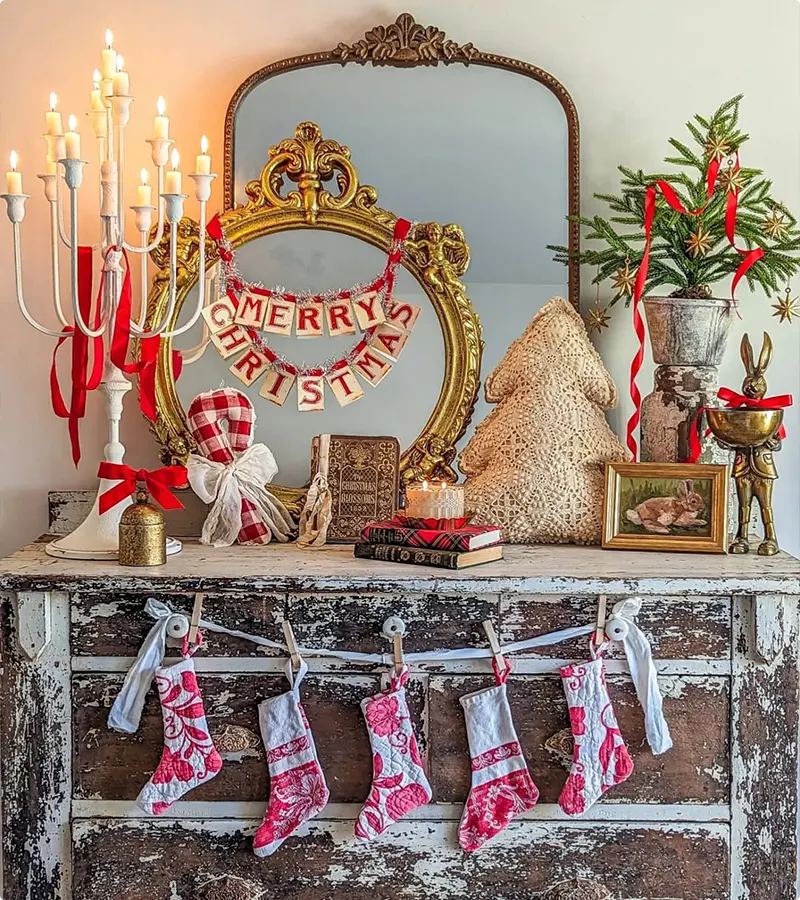 Look at this gorgeous display! I’m obsessed with how they put the fancy gold mirror right on top of that distressed, chipped dresser. It’s the definition of shabby chic for Christmas.