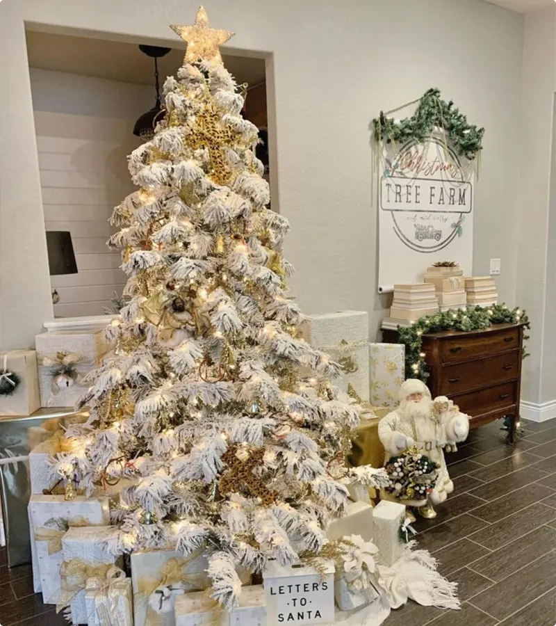 Wow, that tree is just dripping with cozy white flocking and warm lights, making it look unbelievably heavy with snow, I love it! The gifts wrapped in simple white and gold paper underneath are actually a huge part of the decor, creating a beautiful, bright foundation for the entire look.