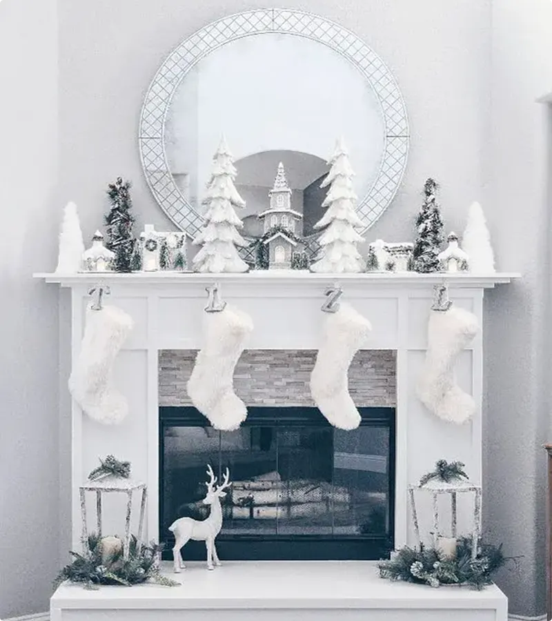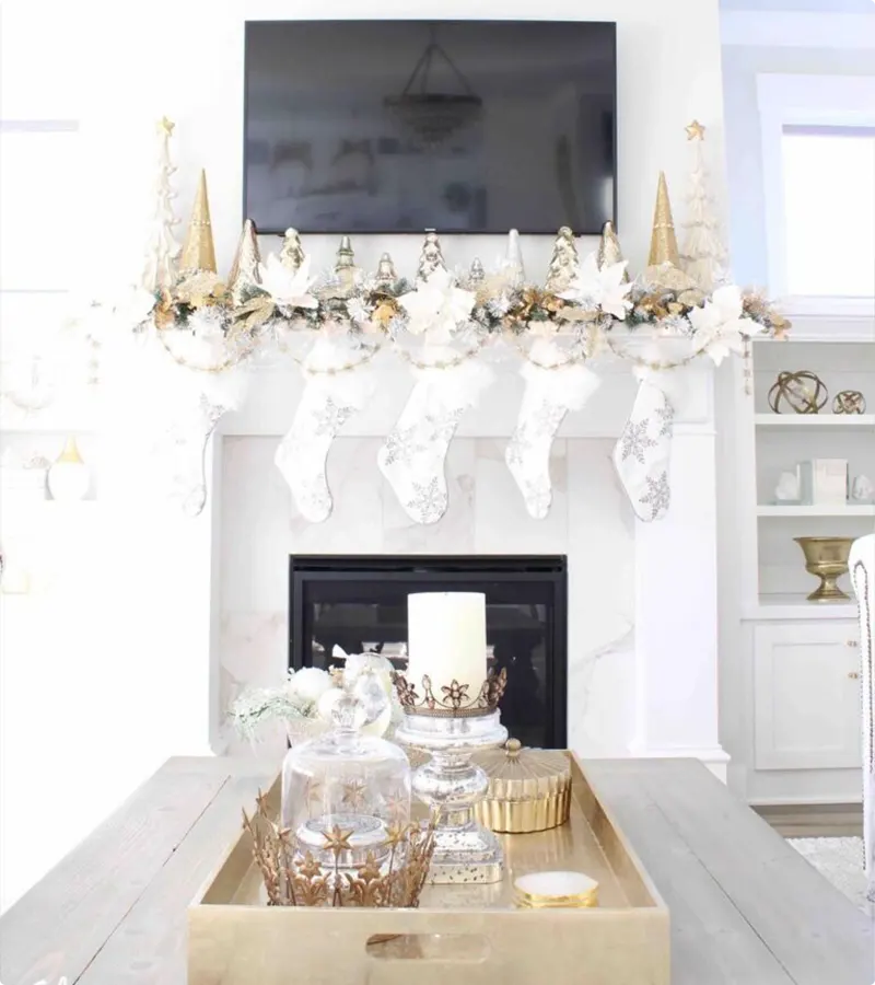 See how the white marble fireplace serves as the perfect crisp, bright backdrop for the decorations? It just makes the whole display feel super fresh and expensive, which is great for a White Christmas look.