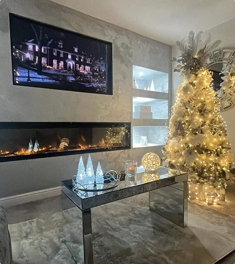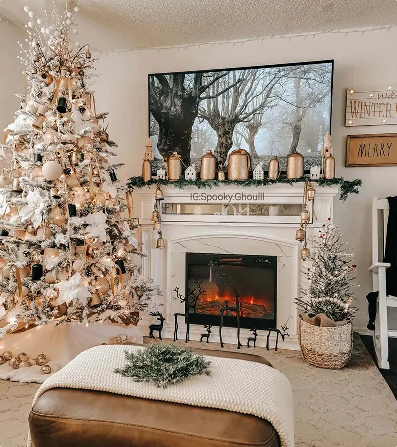 Even the mirror above the fireplace has that frosty, sparkling detail, making the whole thing feel like a peaceful, airy sanctuary ready for the holidays.
