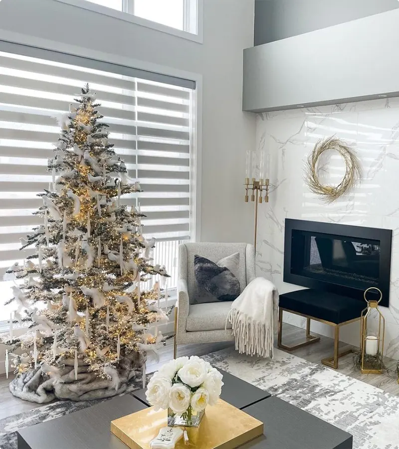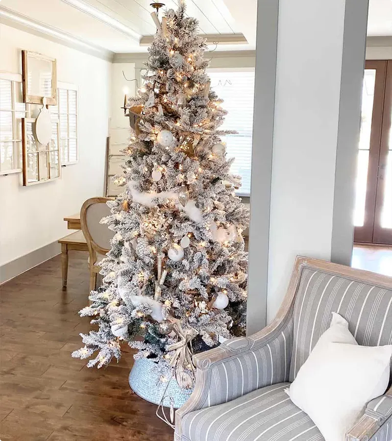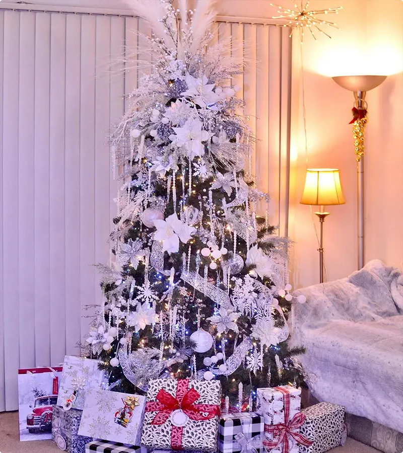 White Christmas decorations use colors like white, silver, and light gold to make your home look like snow! They help make everything feel calm, pretty, and bright for the holidays.