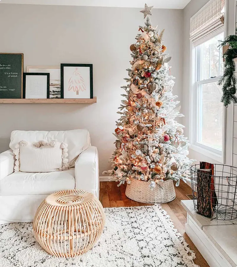 The skinny, tall flocked tree here is perfect for a smaller corner, and wrapping the base in that big, woven basket instead of a traditional skirt is such a clever design move, don’t you think?
