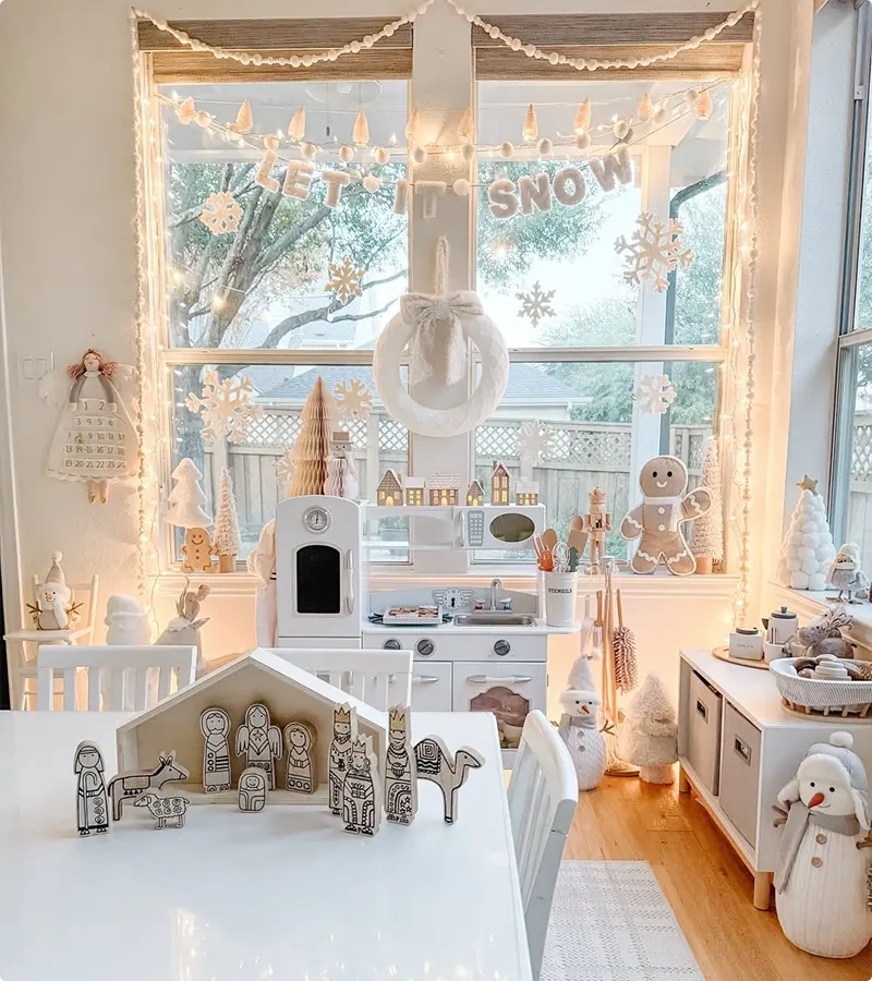 The absolute best part of this design is that they kept everything on the table and counter low and reachable, using charming white wooden figures and soft stuffed snowmen instead of fragile ornaments.