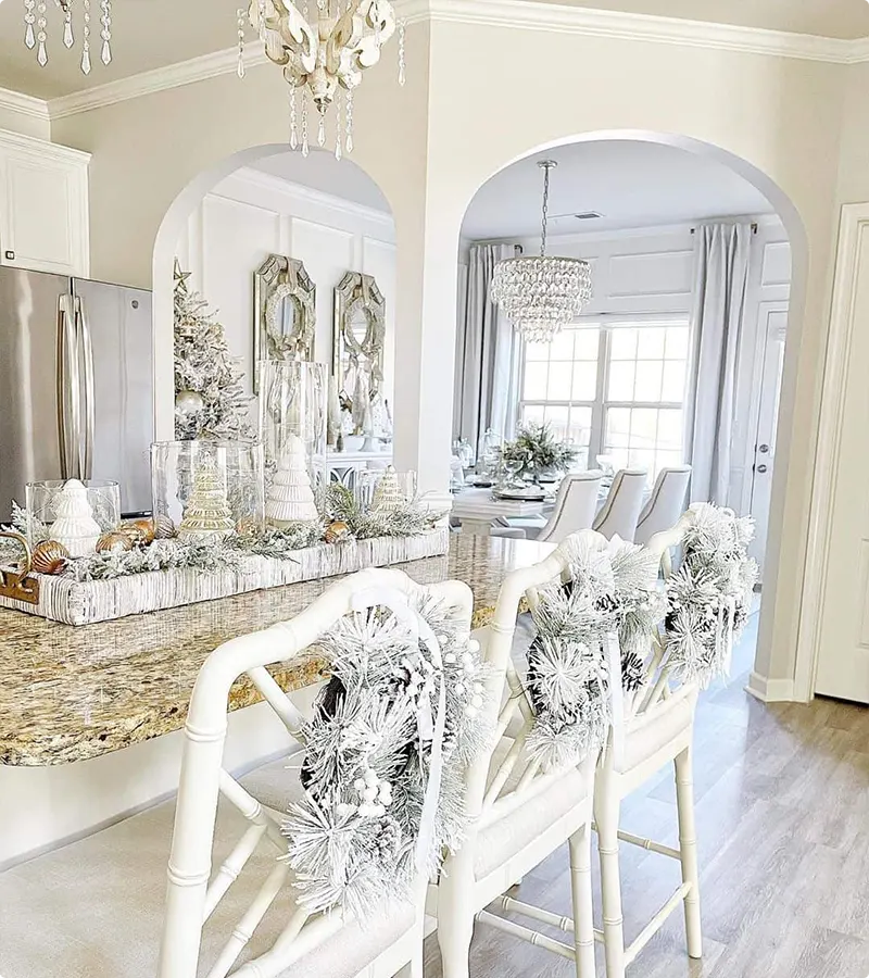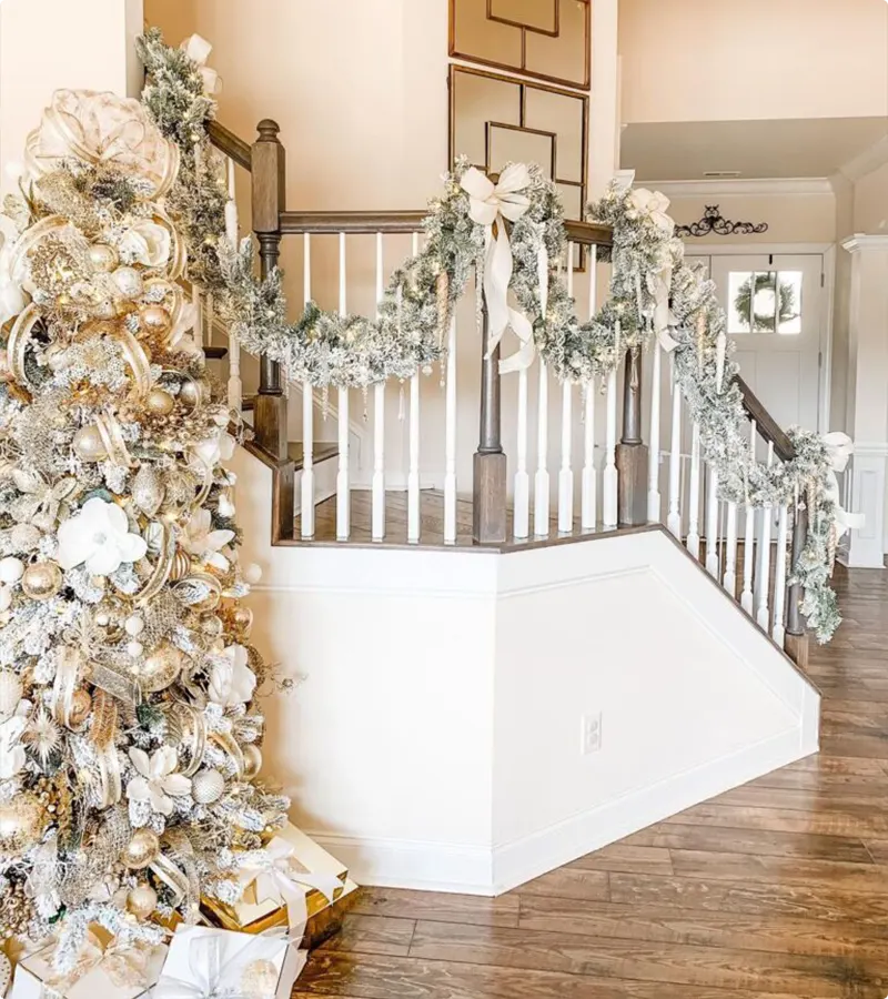 White is a color that goes well with almost everything! It’s like a blank canvas that lets you mix and match your favorite shades. For a fancy and shiny look, pair white with silver or gold. These colors make your home sparkle and glow under the Christmas lights.