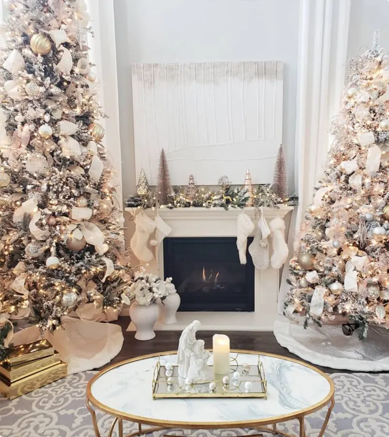 This look is pure elegance because they decided to mix the flocked white base with super soft blush and champagne gold accents, which is genius. By keeping the palette light, they made sure the two massive trees don’t overpower the room, but instead they just glow!