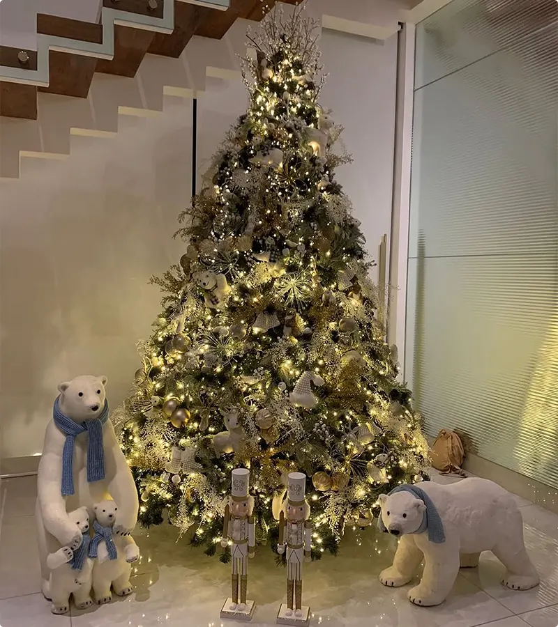 The brilliant part is those adorable life-sized polar bear figures; they bring in a massive amount of white texture and instantly create that North Pole story right at the base of the tree.